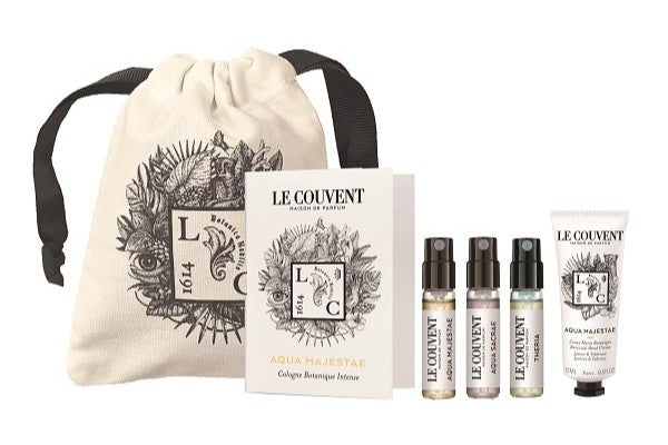 LE COUVENT人気の4種の香りを楽しめるトライアルセットが限定発売。3種のフレグランス(1.5mL)とアクアマジェスタエの香りのハンドクリームをミニサイズでお試しいただけます。持ち運びに便利な巾着ポーチつき。