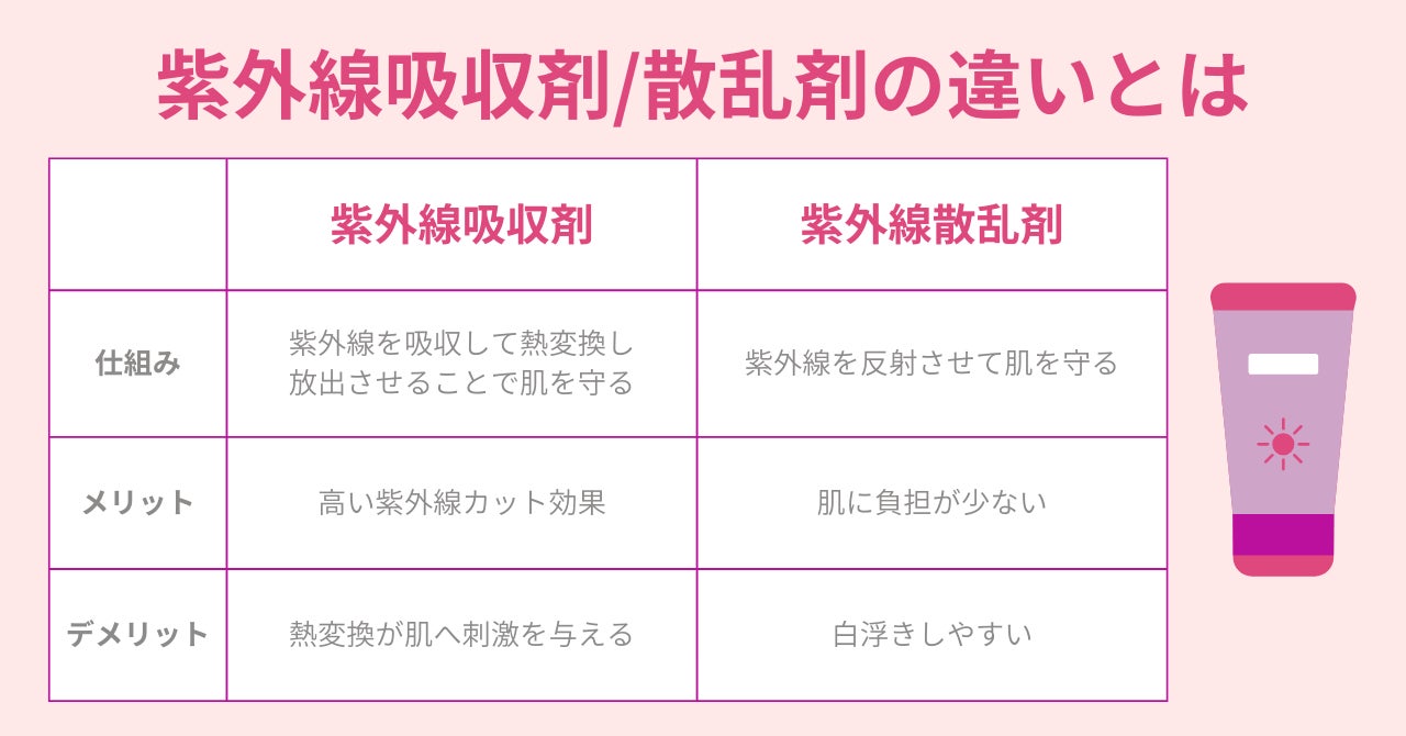 上記の表のように、紫外線吸収剤と紫外線散乱剤は異なっています。