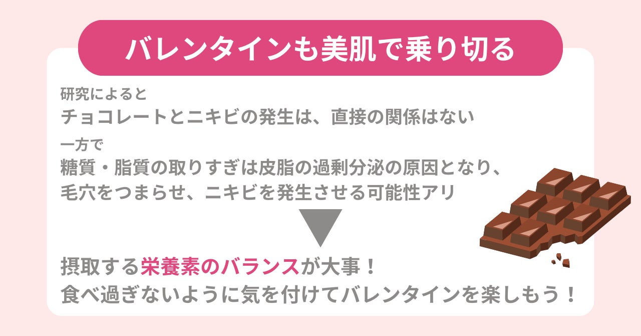 チョコレートは直接的なニキビの原因ではありませんが、糖質・脂質を多く摂取し、その他の栄養素とのバランスが崩れてしまうと、肌が荒れてしまうのです。