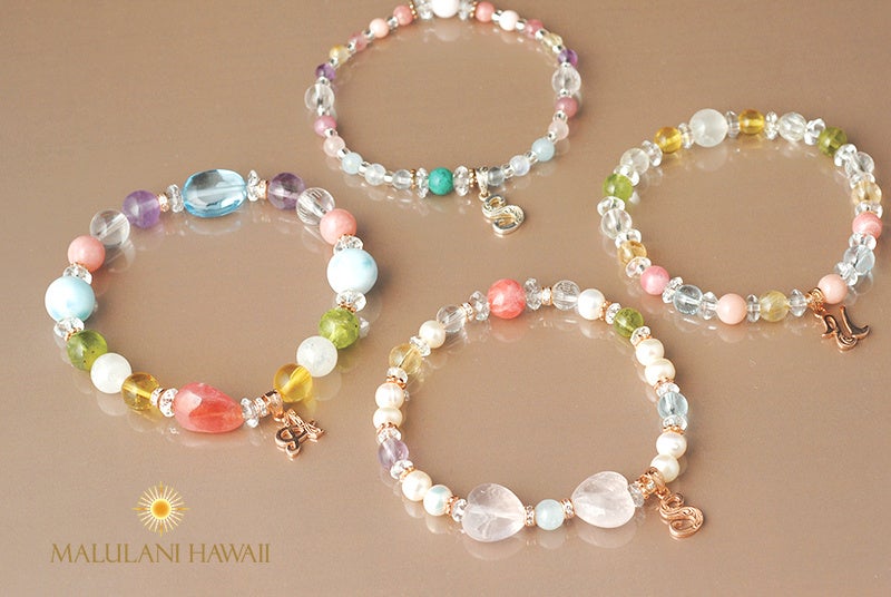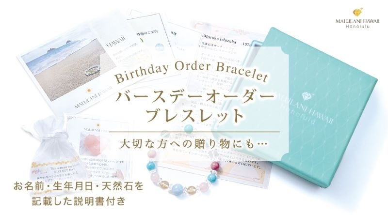 マルラニハワイ不動の人気を誇る「バースデイオーダーブレスレット」は、一人一人の生年月日より「守護石」を選定し、お願い事の石を組み込んで作成する、世界でたったひとつの天然石ブレスレット。