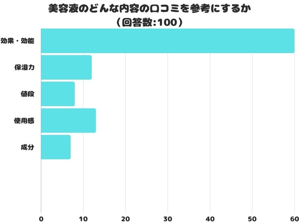 美容液のどんな内容の口コミを参考にするかをアンケートにて調査したところ、1位は「効果・効能」でした。