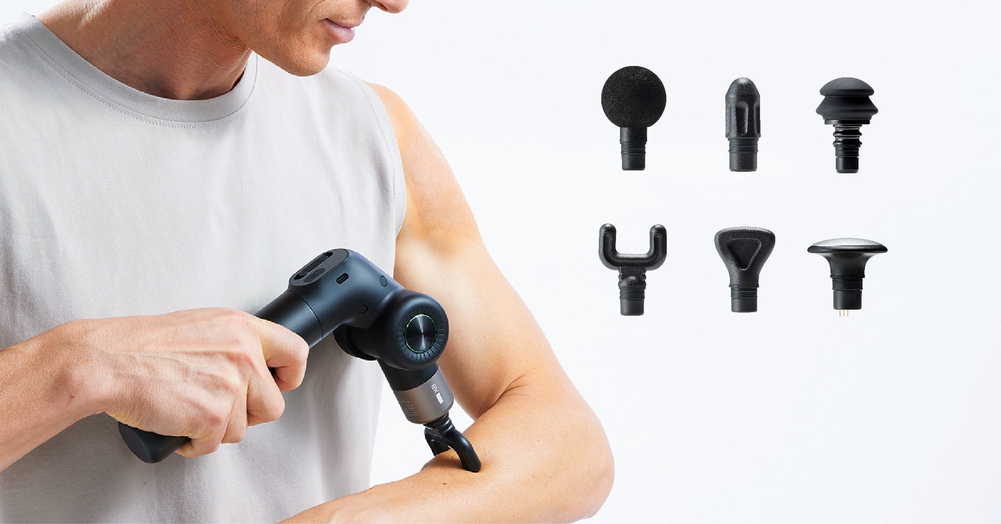 大きな筋肉から細かな筋肉までに対応する6種類のアタッチメントを付属。運動前のウォーミングアップや、運動後やお休み前のボディメンテナンスにも。