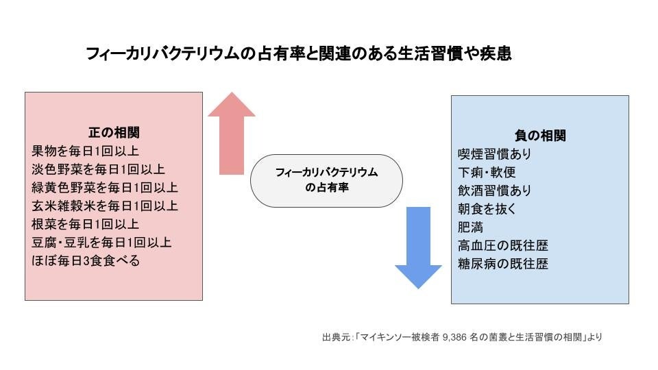 サイキンソーが所有するマイキンソーデータからも、慢性疾患や持病がない人は酪酸菌の占有率が高くフィーカリバクテリウムの占有率も高いことが分かっております。特に、毎日3食しっかり食べることや、野菜や玄米など腸に良いとされる食材を1日1回以上食べるなど、普段の生活習慣を意識されている方ほど、フィーカリバクテリウムの占有率が高い傾向があることも判明しております。逆に、喫煙や飲酒の習慣、朝食を抜く傾向がある方は、フィーカリバクテリウムの占有率が低い傾向にあることも分かっています。さらに、肥満や高血圧、糖尿病などを生活習慣病を患っている方も、フィーカリバクテリウムの占有率が低いという相関が見られました。