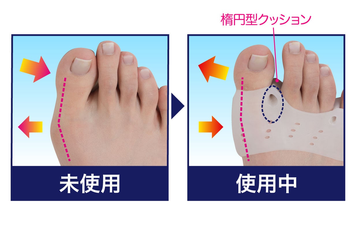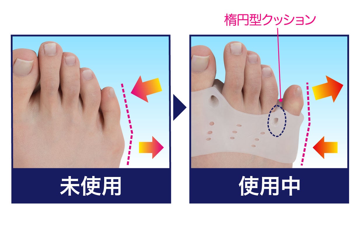 親指と人差し指の間にある大きな楕円型クッションが親指を外側へグッと広げて、足指の角度を自然で緩やかにします♪快適な使い心地で、歩行がらくらく!