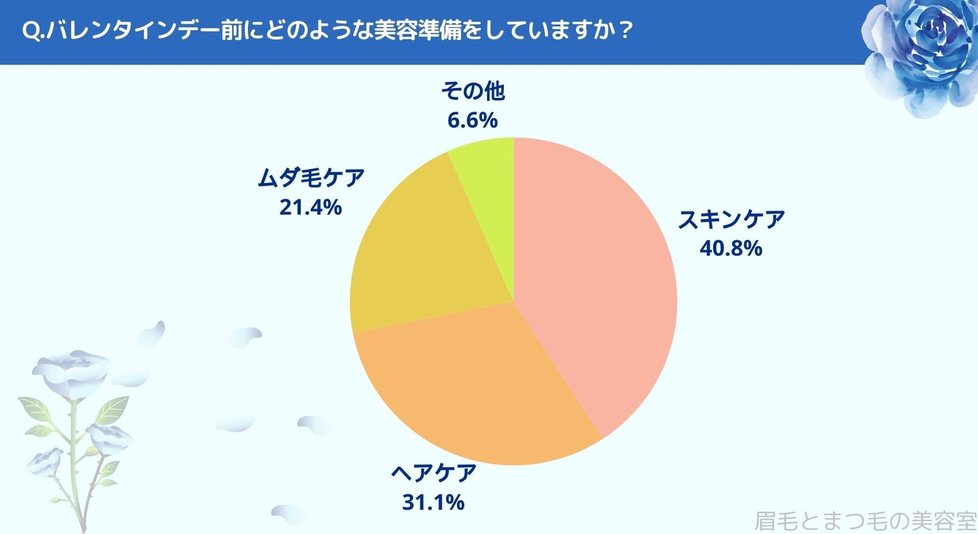 バレンタインデー前にどのような美容準備をしているかお聞きしたところ「スキンケア(40.8%)」、「ヘアケア(31.1%)」、「ムダ毛ケア(21.4%)」、「その他(6.6%)、という結果になりました。
