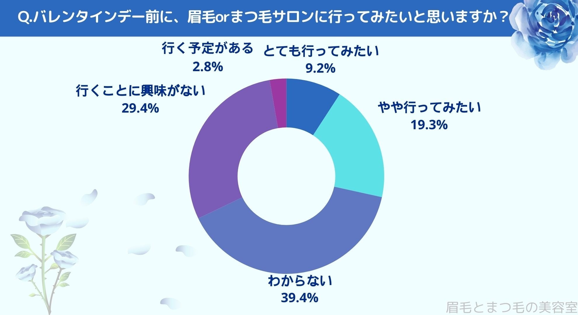 バレンタインデー前に、眉毛orまつ毛サロンに行ってみたいと思うかお聞きしたところ「とても行ってみたい(9.2%)」、「やや行ってみたい(19.3%)」、「わからない(39.4%)」、「行くことに興味がない(29.4%)」、「行く予定がある(2.8%)」という結果になりました。
