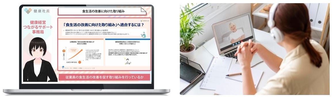 健康経営優良法人認定の取得を目指す企業は毎年増加していますが、当社が実施した健康経営に関する調査*2によると、中小企業経営者を含む健康経営担当者のうち85%が「従業員の健康を気にしている」と回答しているものの、「何から始めたらよいか分からない」「ノウハウが不足している」等の悩みを抱えていることが分かりました。そこで、これまでも企業の健康課題解決に向けた支援を行ってきた経験から、2022年7月に関連資格を有する当社社員による支援として【健康経営つながるサポート】(有償サービス)の本格運用を開始。このたび新たに公開した【健康経営つながるサポート ONLINE】においては、多様な健康コンテンツや健康専門家の講演、オンライン面談など、経営者や健康経営担当者がいつでもどこでも利用できるサービスを新たに追加しています。