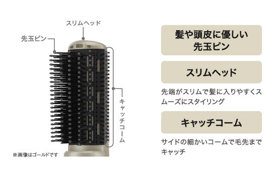 幅広ブラシが髪の根元からしっかりキャッチし、トップをふんわり立ち上げたり、ブラシのサイドに配したキャッチコームで毛先まで逃さず、まとまりのある仕上がりへとサポートします。ピンには髪や頭皮に優しい先玉を採用。またブラシの先端はスリムで髪の間に入りやすく、使いやすさを考慮しました。