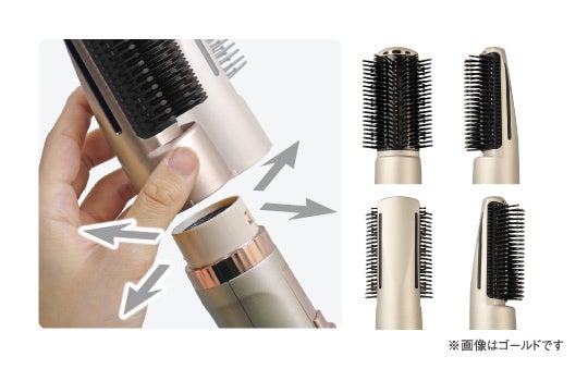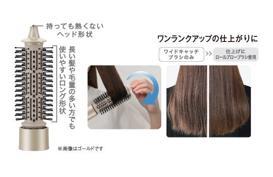2種類のブラシは、髪の根元からしっかりとキャッチする幅広の「ワイドキャッチブラシ」と、直径55mmの太めのロールにピンと柔らかなナイロン植毛を360度に配した「ロールブローブラシ」(※1)をご用意。それぞれのブラシを使い分けることで、立体感があり、まとまりのある美しいヘアスタイルへと導きます。