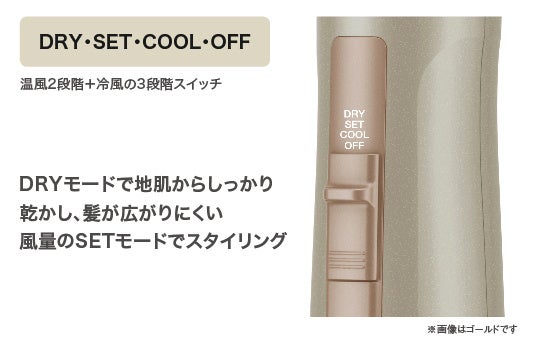 操作しやすい3段階の切替スイッチは、「DRY」モードで地肌からしっかり乾かし、髪が広がりにくい風量の「SET」モードでスタイリングを。「COOL」モードで冷風に切り替えられます。「DRY」、「SET」モードは温風2段階の調節が可能です。