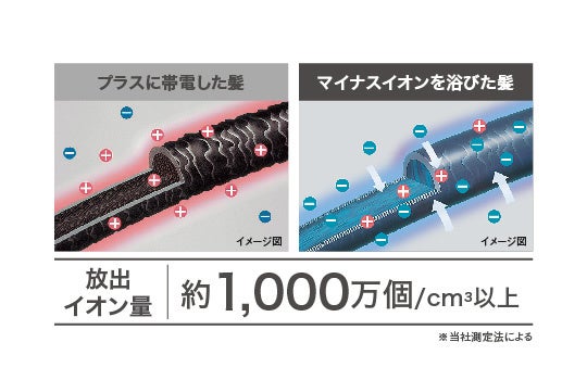 一般的に髪はプラスの静電気を帯電しやすく、ヘアドライ時の髪摩擦によっても発生します。ヘアドライヤーの使用時にマイナスイオンを放出(※3)することで髪の広がりの一因である静電気を低減し、まとまりのある髪へと導きます。