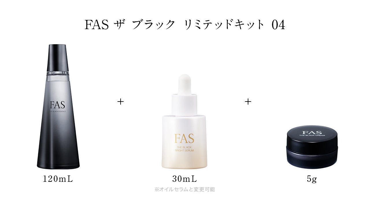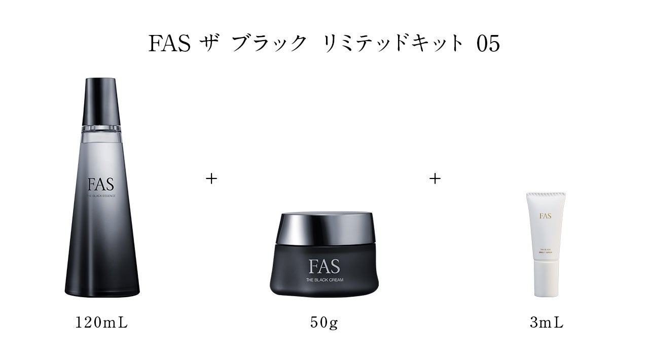 内容:FAS ザ ブラック エッセンス 120mL、FAS ザ ブラック クリーム50g[医薬部外品](販売名:Fクリーム)、FAS ザ ブラック ブライトセラム ミニ3mL[医薬部外品](販売名:FBセラム)(非売品)