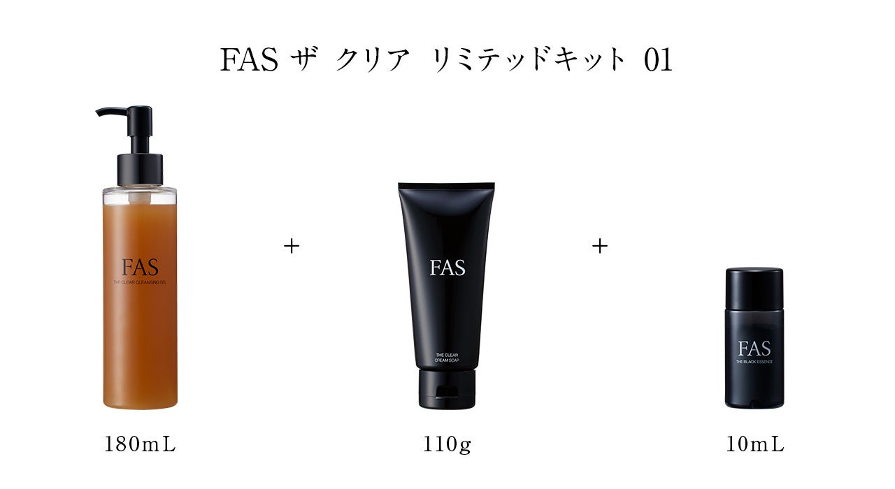 内容:FAS ザ クリア クレンジングジェル 180mL、FAS ザ クリア クリームソープ 110g、FAS ザ ブラック エッセンス 10mL(非売品)