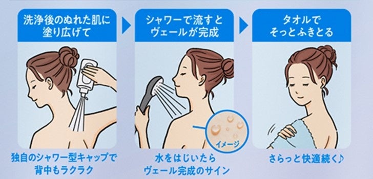 一方、『ビオレZero お風呂で使う汗ケアローション』は、洗浄後の肌に塗布した後、シャワーで流すタイプのボディローションです。独自のシャワー型キャップで、手の届きにくい背中にも簡単に使えます。『ビオレZero シート』と同様、汗を乾かし続ける「持続型パウダーヴェール」技術を採用。入浴後から翌朝の寝起きまでさらっと快適が続きます。