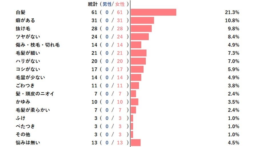 今回のアンケートで「髪に関する悩みのうち、あてはまるものを選んでください」とアンケート調査をした結果、1位は『白髪』でした。