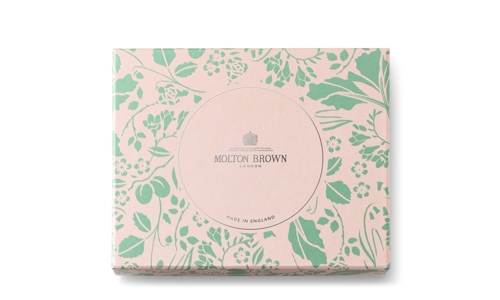 パステルピンクとグリーンのギフトボックスは、英国の春の美しさにインスパイアされてデザインしました。春に芽吹く花々がエンボス加工で描かれています。
