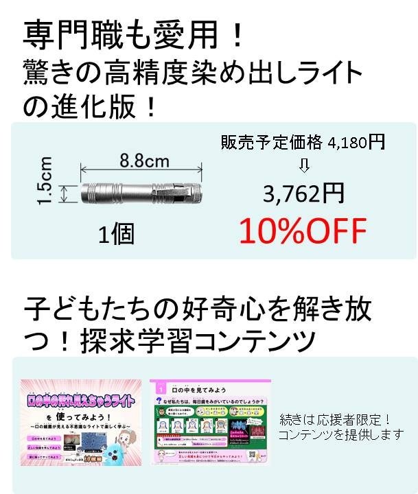 デンタルライトは人体に無害な光であるため、 光を使った遊び感覚も取り入れながら、 お子さんのお口の状態を客観的に視ると、 楽しみながら正しい歯磨き習慣へとステップアップできるかもしれません。