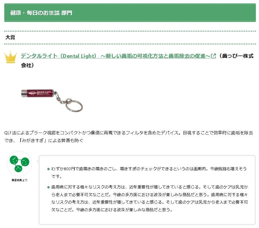このアワードは、子育てを支援する優れた技術・製品を表彰するもので、デンタルライトは、乳幼児の口腔ケアを楽しく、簡単にできる革新的な製品として評価されました。