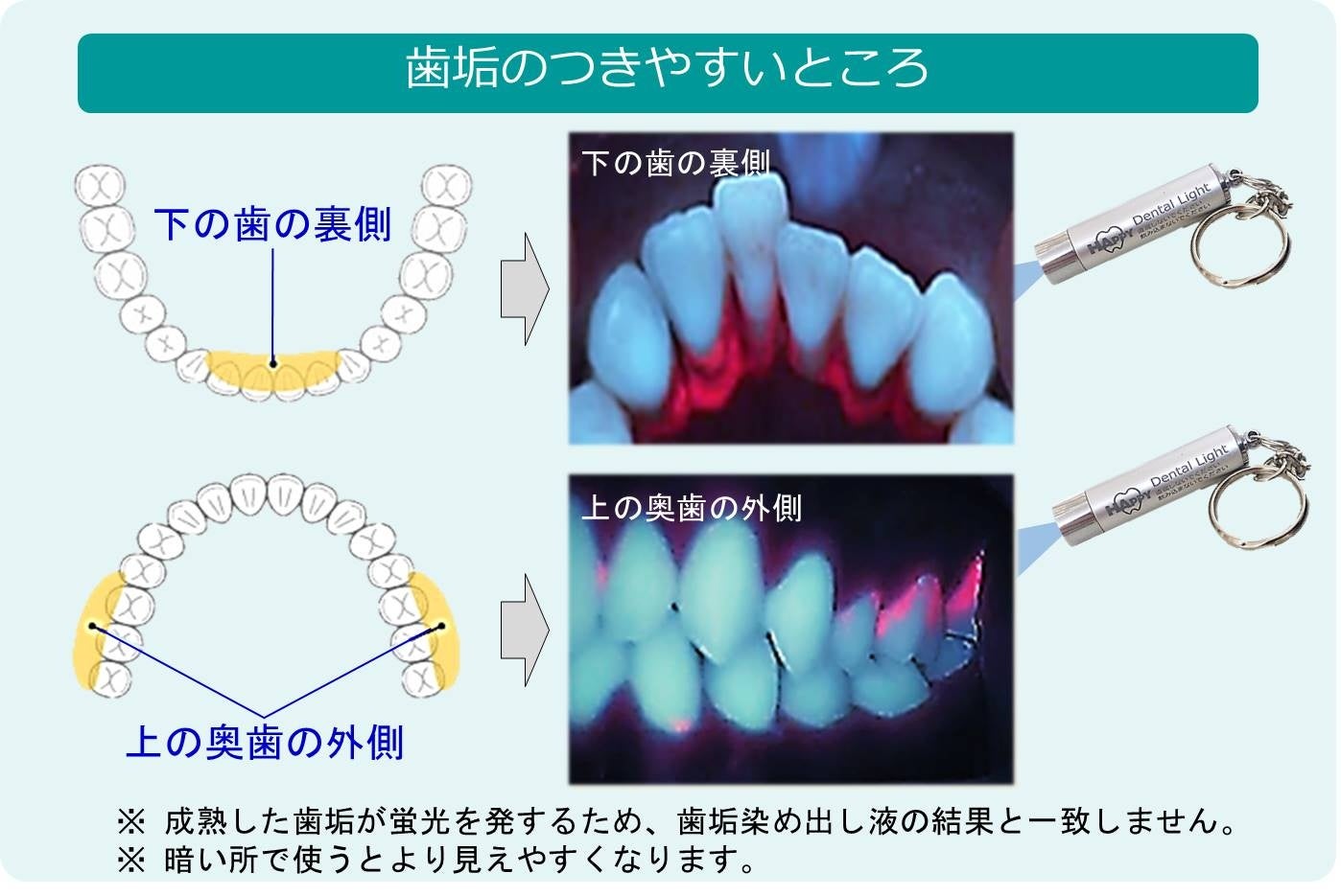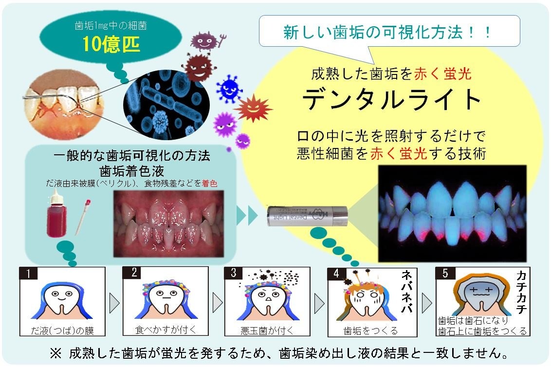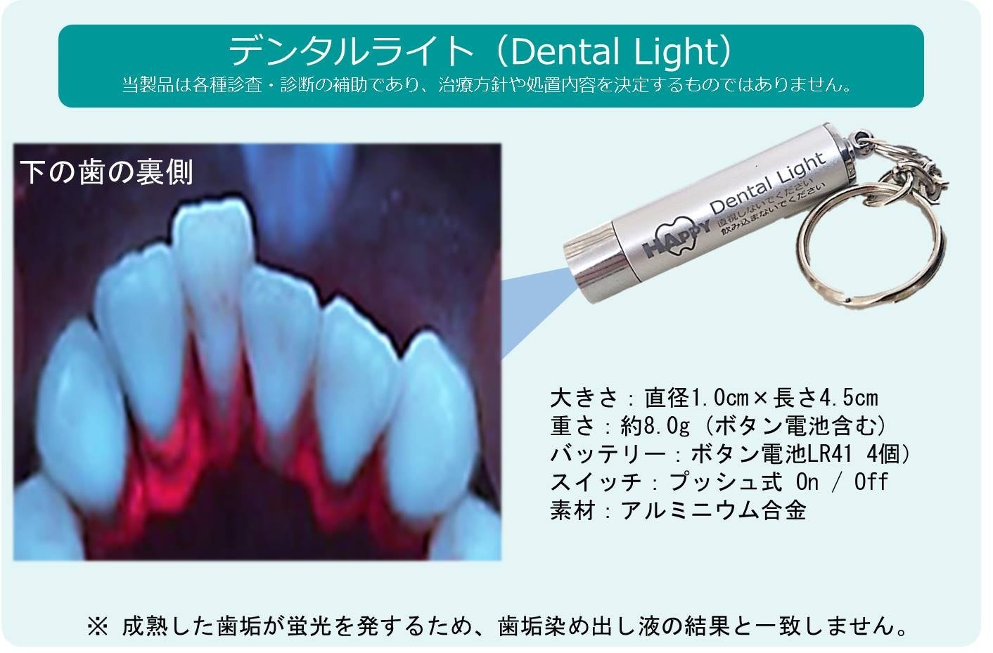 デンタルライト(Dental Light)は、1995年に発明されたとされる光学的診査技術の一つである QLF法、光誘導蛍光定量法を応用した検査器具です。青紫色の可視光を歯の表面に照射することにより、健康な歯は青色に、歯垢や歯石が溜まっている箇所は赤紫やオレンジ色に蛍光します。