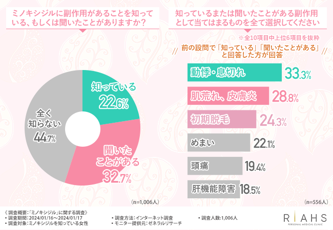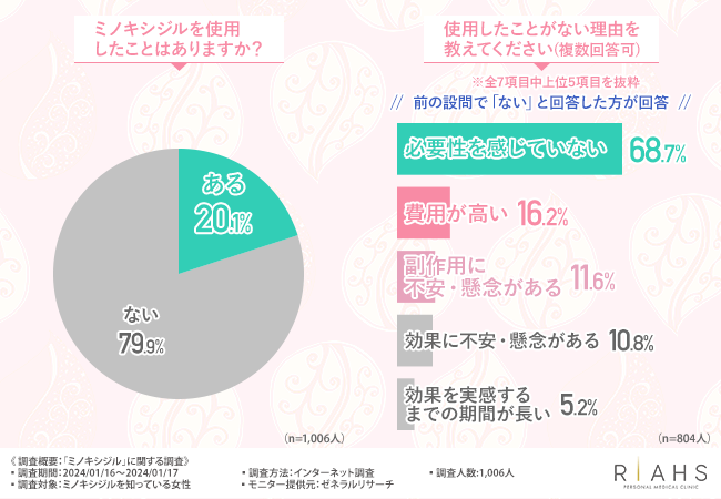 そこで今回、発毛専門の医療機関『リアスクリニック』(https://riahsclinic.com/)は、ミノキシジルを知っている女性を対象に「ミノキシジル」に関する調査を実施しました。