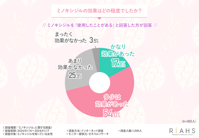 「ミノキシジルの効果はどの程度でしたか?」と質問したところ、『かなり効果があった(17.3%)』『多少は効果があった(54.0%)』『あまり効果がなかった(25.3%)』『まったく効果がなかった(3.5%)』という回答結果になりました。
