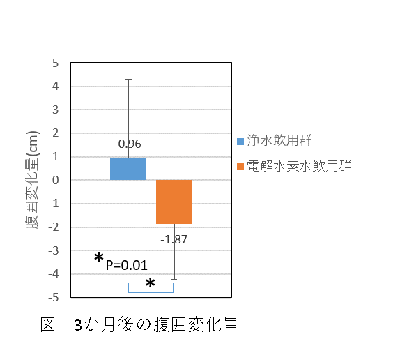 具体的には、電解水素水飲用群は飲用前に比べ腹囲が平均1.87cm減少、一方、浄水飲用群は平均0.96cm増加しました。