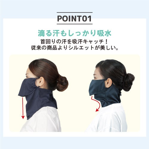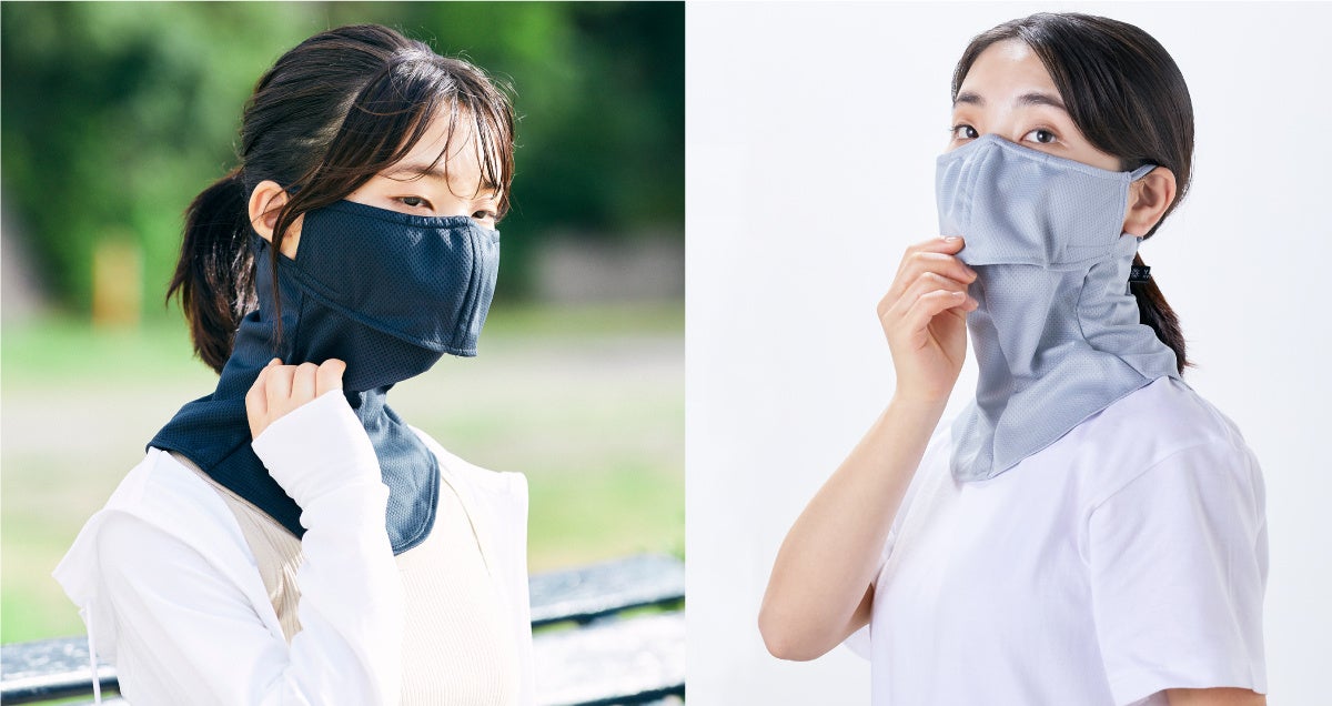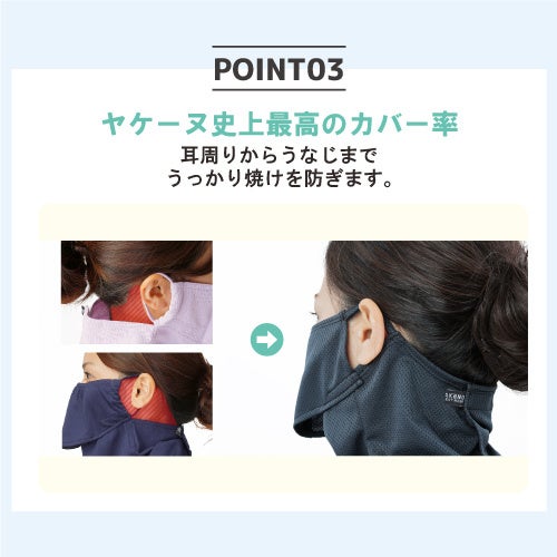 形は変わってもヤケーヌ独自の3つのポイント「息苦しくなく呼吸しやすい」、「着けたまま飲み物が飲める」、「メガネが曇りにくい」のはそのまま使いやすさを継承。チタンが練り込まれた日本製の高機能糸を使用することで、何度洗濯をしてもUVカット効果が持続します。また、強い日差しの下でも遮熱効果と打ち水クーリング効果により、フェイスカバー内の温度上昇を抑え、従来のポリエステルと比較して3℃以上涼しく着用することができます。
