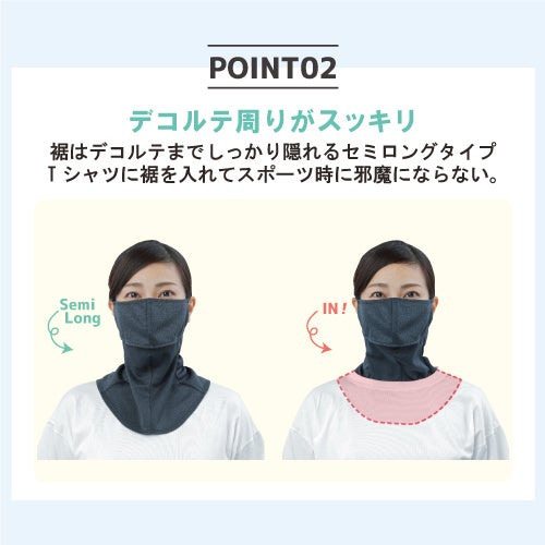 デコルテ部分をスッキリと見せながらも長くする事で服の中へ仕舞い込む事が可能に。動いても襟ぐり境目が風で露出するのを軽減できます。