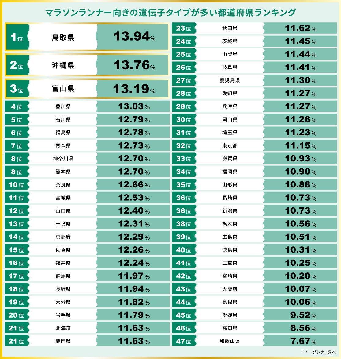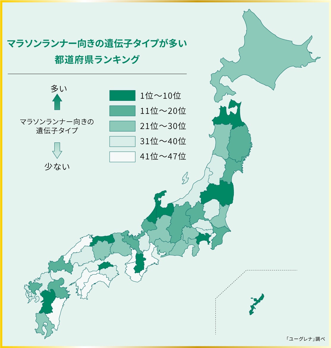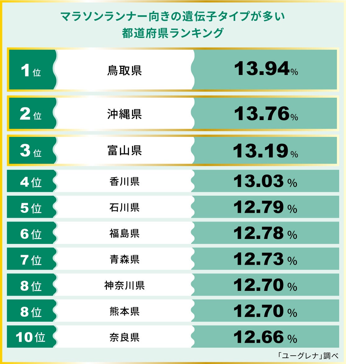 株式会社ユーグレナ(本社:東京都港区、代表取締役社長:出雲充)は、国内最大規模の市民マラソン「東京マラソン」の開催を前に、ユーグレナ・マイヘルスとジーンクエストの遺伝子解析サービスのゲノムデータをもとにした「マラソンランナー向きの遺伝子タイプが多い都道府県※1ランキング」を公開します。