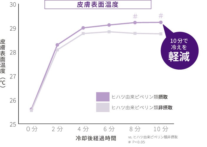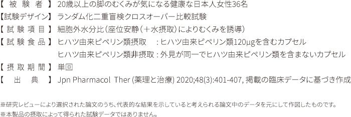 ヒハツ由来ピペリン類は、冷えにより低下した血流(末梢血流)を正常に整え、冷えによる末梢(手)の皮膚表面温度の低下を軽減する機能があることが報告されています。また、脚のむくみが気になる健常な女性の夕方の脚のむくみ(病的ではない一過性のむくみ)を軽減する機能があることが報告されています。