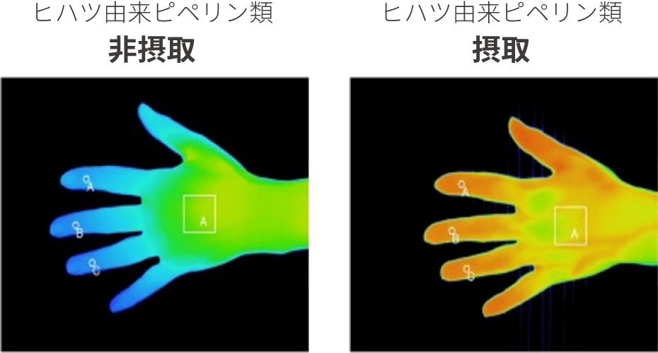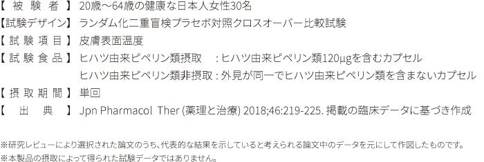 ヒハツ由来ピペリン類は、冷えにより低下した血流(末梢血流)を正常に整え、冷えによる末梢(手)の皮膚表面温度の低下を軽減する機能があることが報告されています。また、脚のむくみが気になる健常な女性の夕方の脚のむくみ(病的ではない一過性のむくみ)を軽減する機能があることが報告されています。