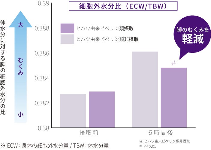 体組成計を用いて細胞外水分比を測定したところ、以下のような脚のむくみを軽減させる結果が報告