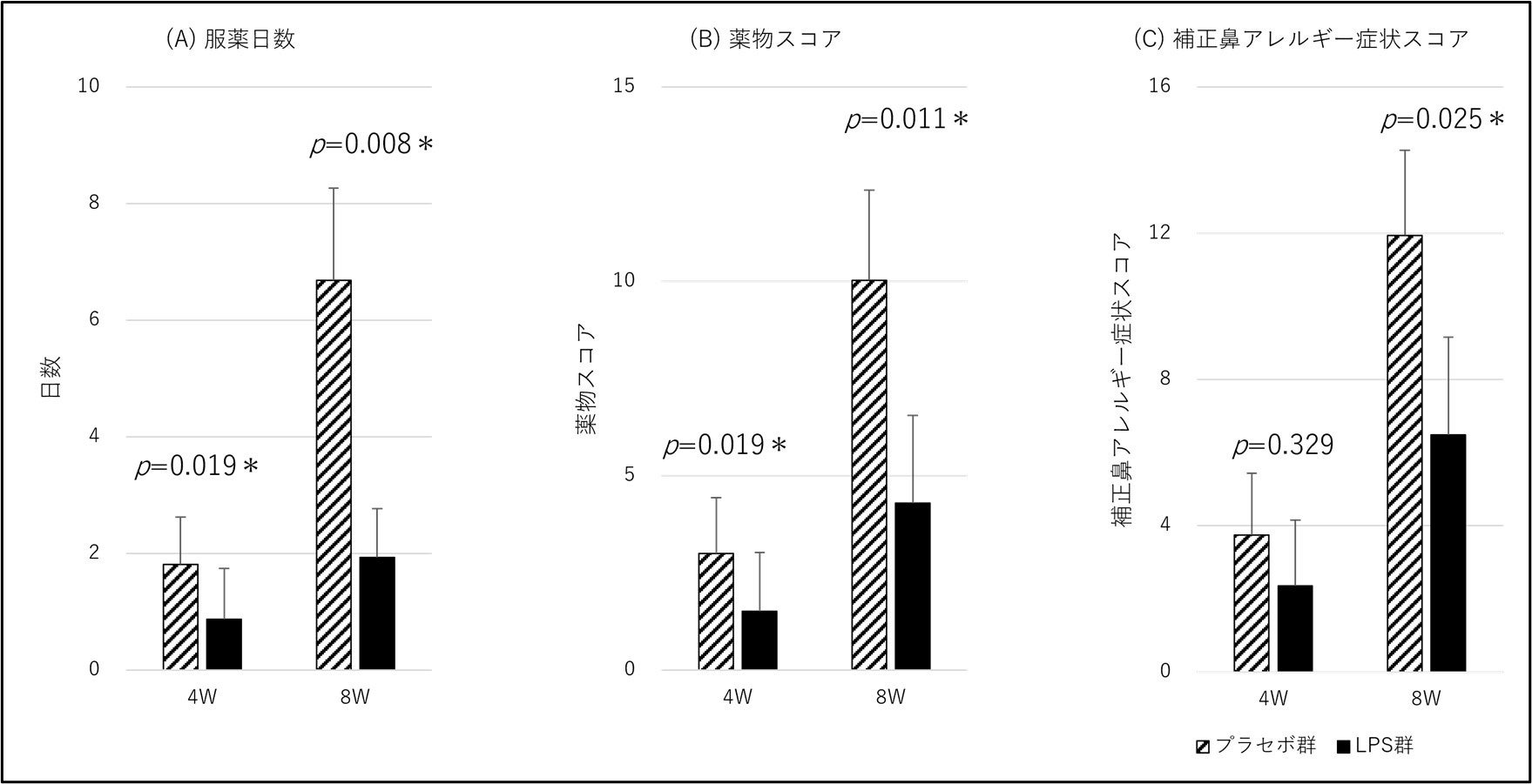 目鼻アレルギー症状のスコアには両グループ間で有意な差は見られませんでしたが、抗アレルギー薬の服用についての解析も行いました。その結果、パントエア菌LPSを摂取したグループは、プラセボを摂取したグループと比べて抗アレルギー薬の使用日数(図2:A)、薬物スコア*3(図2:B)、および補正鼻アレルギー症状スコア*4(図2:C)が統計的に有意に低いことが示されました。また、血液検査で、パントエア菌LPSを摂取したグループは非特異的IgE、ハウスダストやスギ花粉に対する特異的IgE、および好酸球数が低くなる傾向がありました。これはパントエア菌LPSが目鼻アレルギーを和らげる効果があることを示しています。