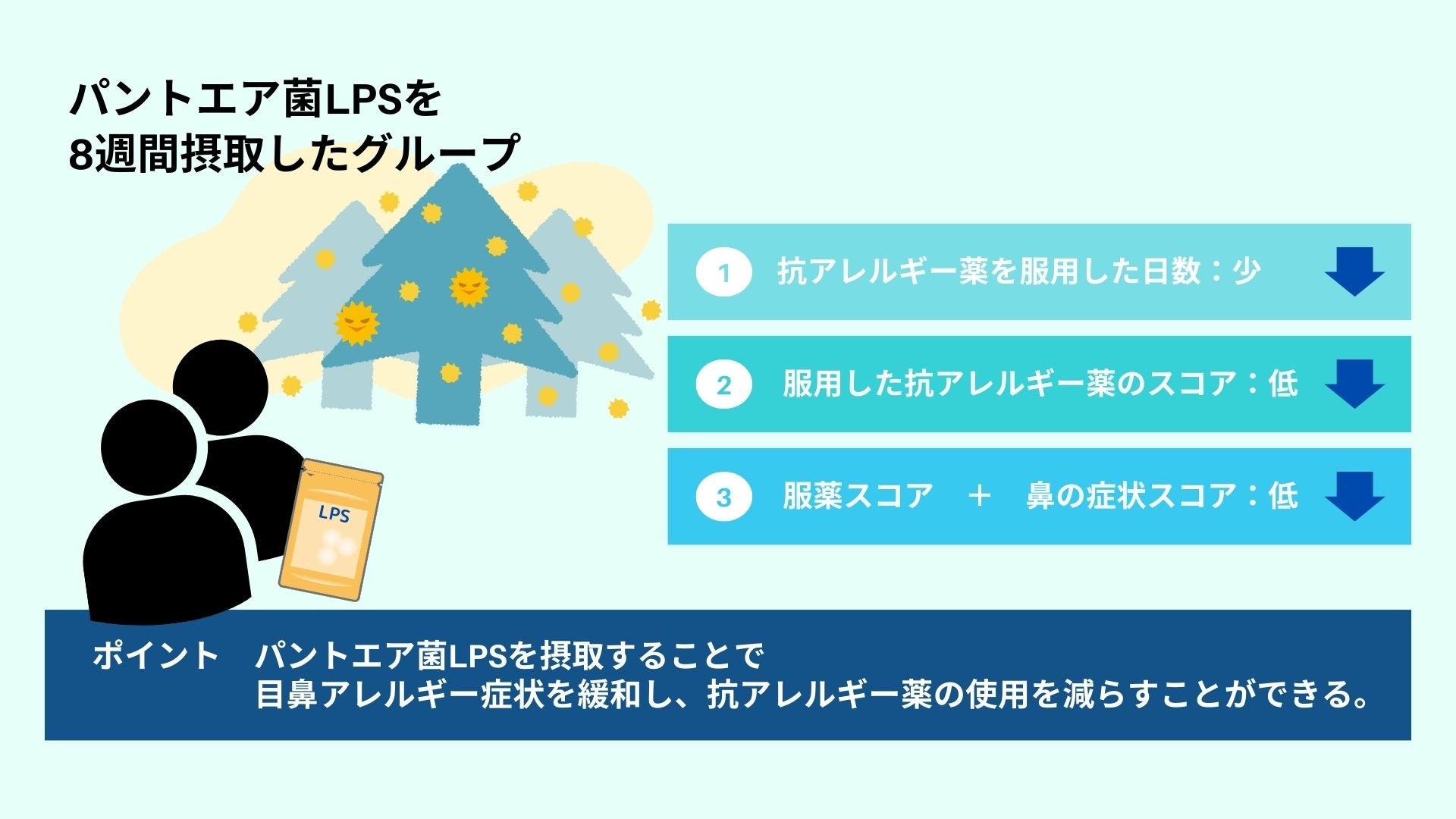 本試験は、軽度の目鼻アレルギーを持つ20歳以上65歳未満の63人を対象に、2023年1月中旬から4月下旬まで香川県内で行われました。被験者はランダムに2つのグループに分けられ、一方のグループはパントエア菌LPSを配合したサプリメントを、もう一方のグループはパントエア菌LPSを配合していないサプリメント(プラセボ)を8週間摂取しました。被験者の目鼻アレルギー症状は「日本アレルギー性鼻炎標準QOL調査票」で評価されました。試験期間中の3月上旬にはスギ花粉、下旬にはヒノキ花粉の飛散が顕著であり、被験者の抗アレルギー薬の使用は制限されませんでした。