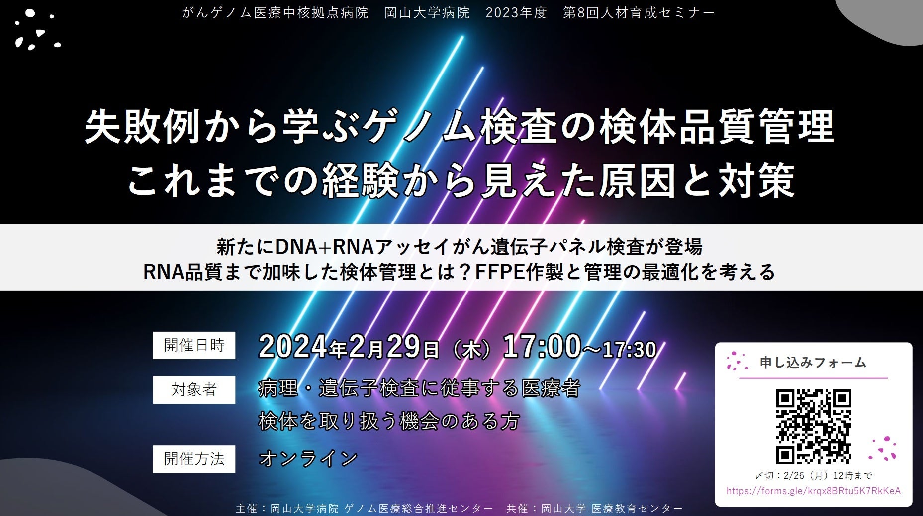 今回、病理・遺伝子検査に従事する医療者や検体を取り扱う機械のある方を対象に、がんゲノム医療中核拠点病院 岡山大学病院 2023年度第8回人材育成セミナー「失敗例から学ぶゲノム検査の検体品質管理 これまでの経験から見えた原因と対策」を、2024年2月29日(木)にオンラインで開催します。