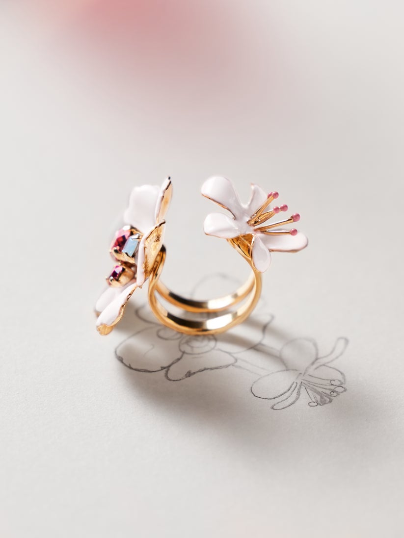 そしてこの特別な香りは、毎年素晴らしいアーティストとのコラボレーションによる、芸術的なボトルで登場します。2024年のエクセプショナル ピースを手掛けるのは、パリのジュエラー『フィリップ・フェランディス』。メゾンのアイコン〈ビーボトル〉に咲く2 輪の桜の花は、取り外してリングとして身に着けることもできます。やわらかな桜の香りと咲き誇