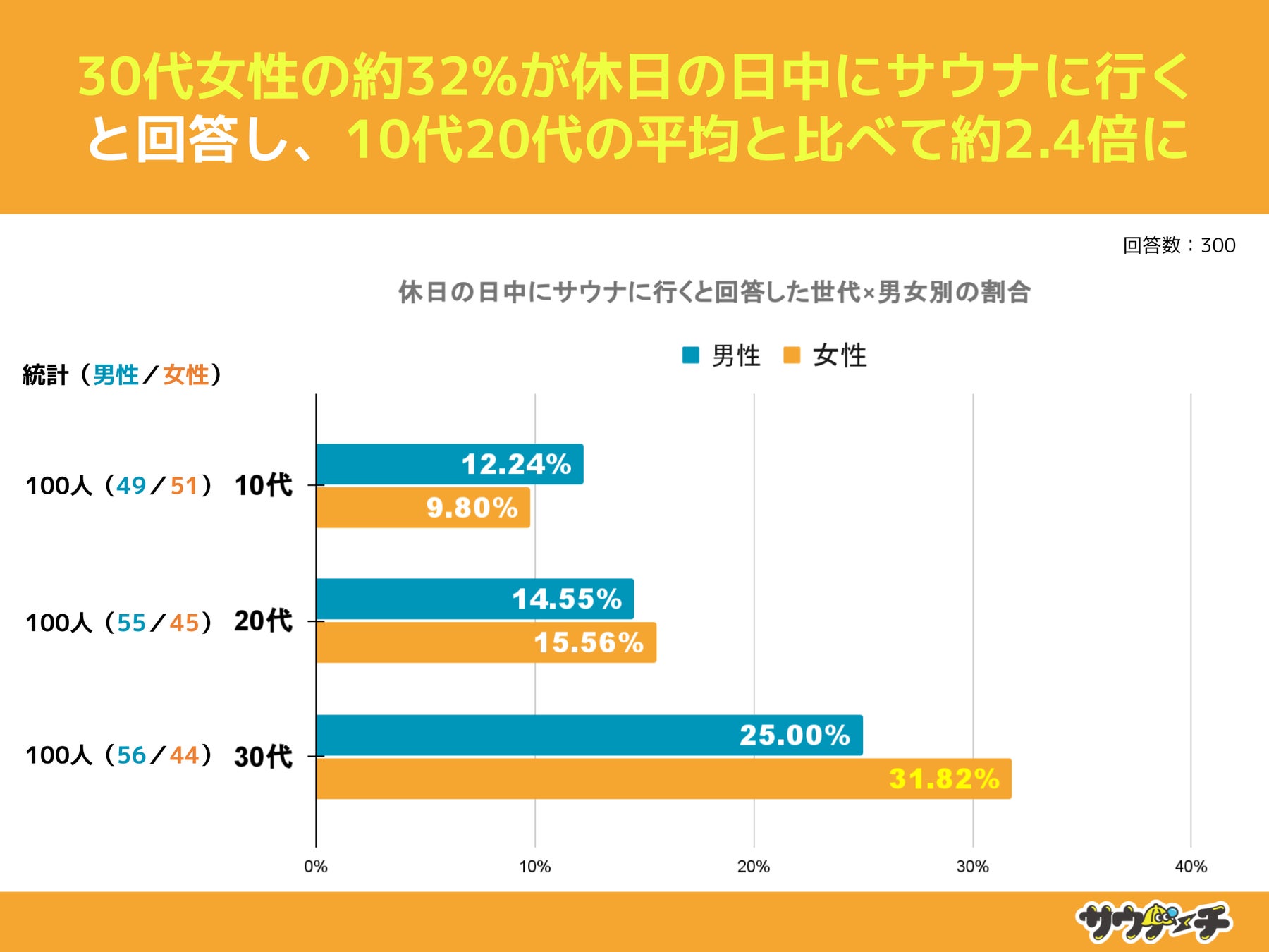 【30代女性の約32%が休日の日中にサウナに行くと回答し、10代20代の平均と比べて約2.4倍に】