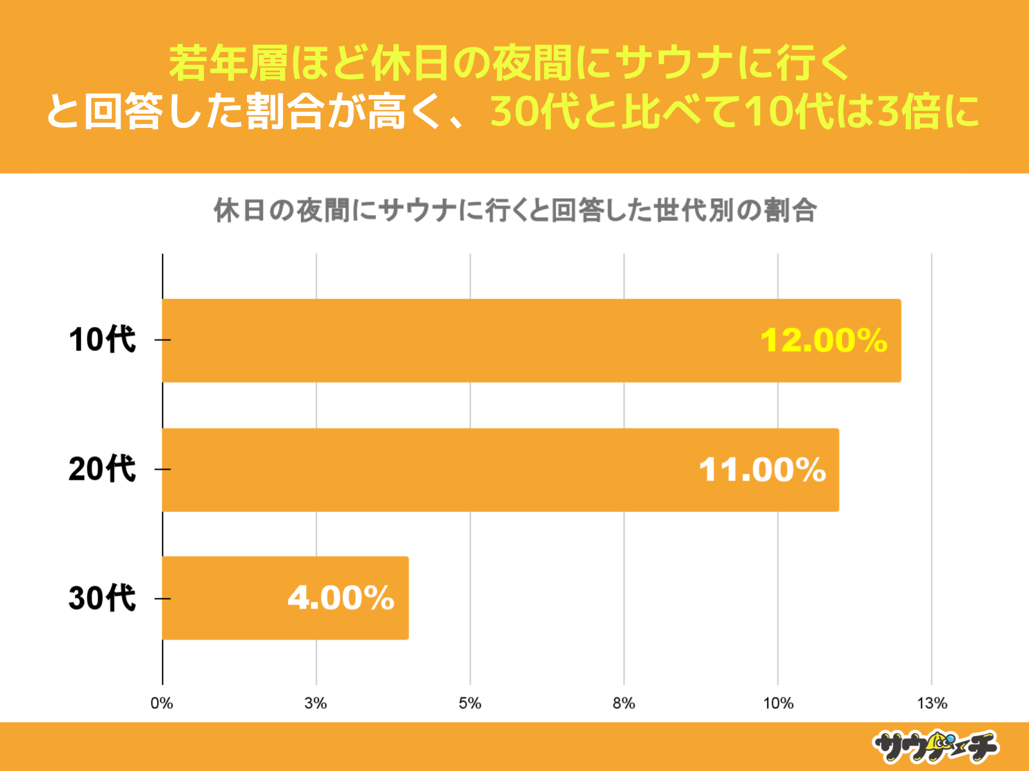 休日の夜間にサウナに行くと回答した割合を世代別でみてみますと、10代の12%が最も高く、次いで20代の11%、30代が4%で、30代と比べて10代は3倍高い結果となりました。