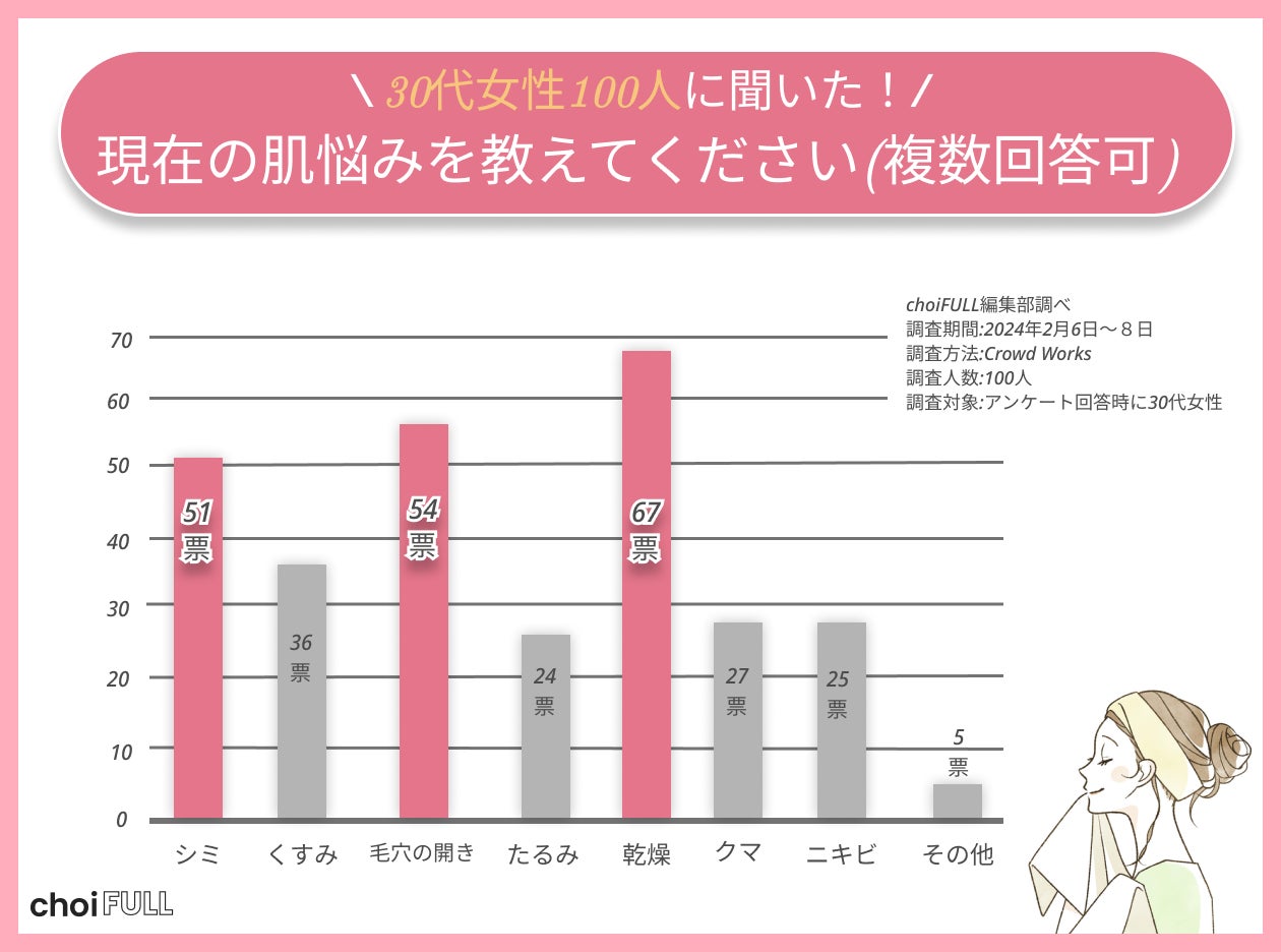 30代女性100人に聞いた肌悩みとして、5割以上の人が乾燥・毛穴の開き・シミに悩んでいると回答しました。実際の声として、下記が挙げられます。