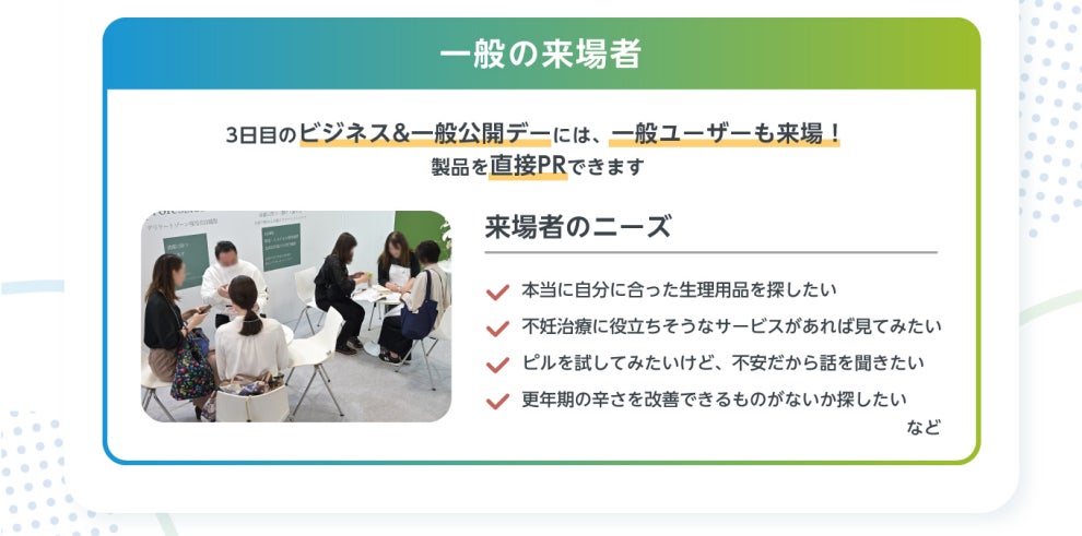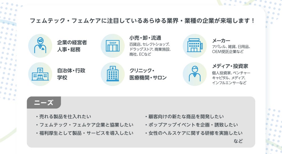 女性のライフステージにおける様々な課題を解決できるフェムテック・フェムケア企業が一堂に出展。企業の経営層をはじめ、小売・メーカー・クリニック・サロン・自治体などが来場する展示会です。