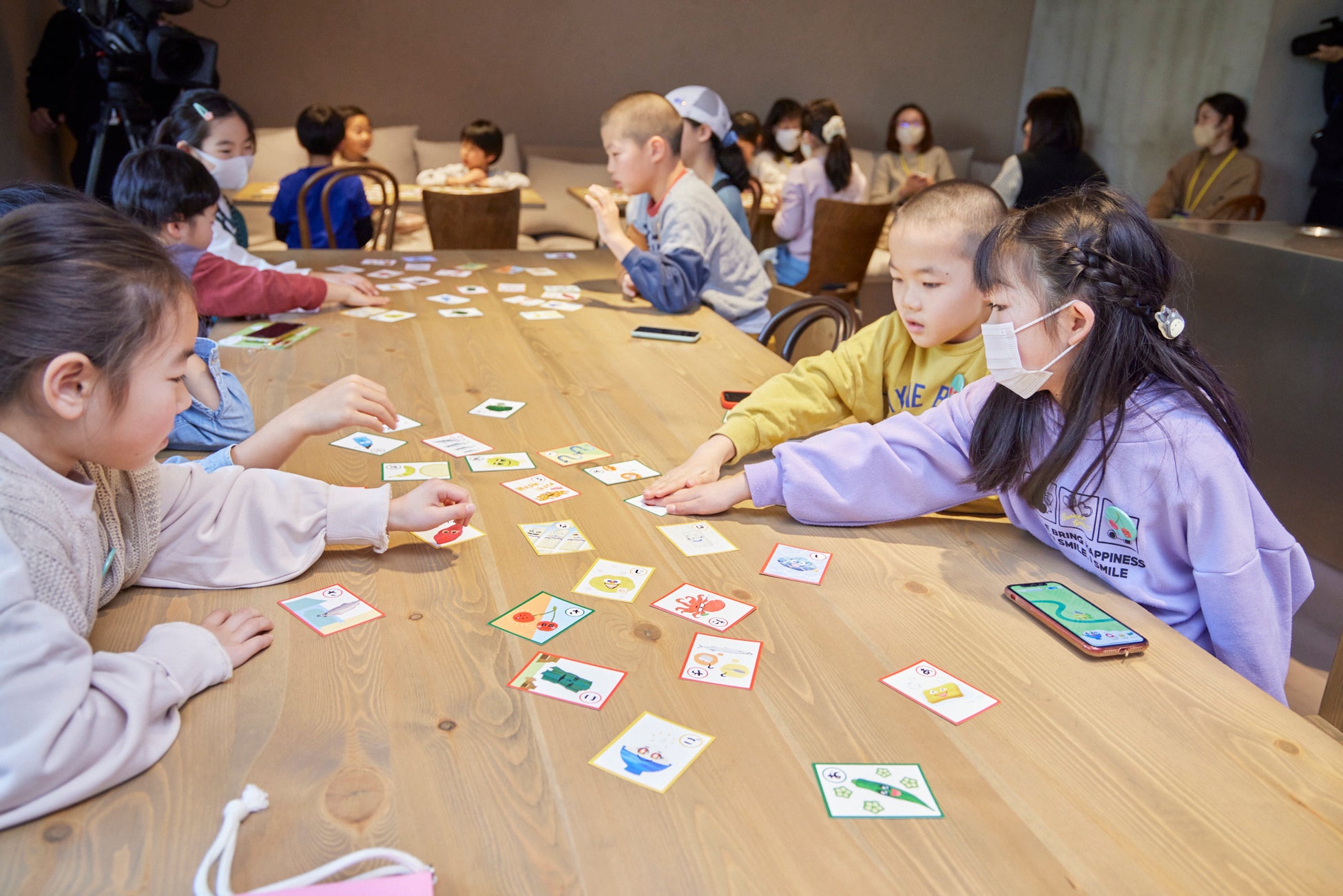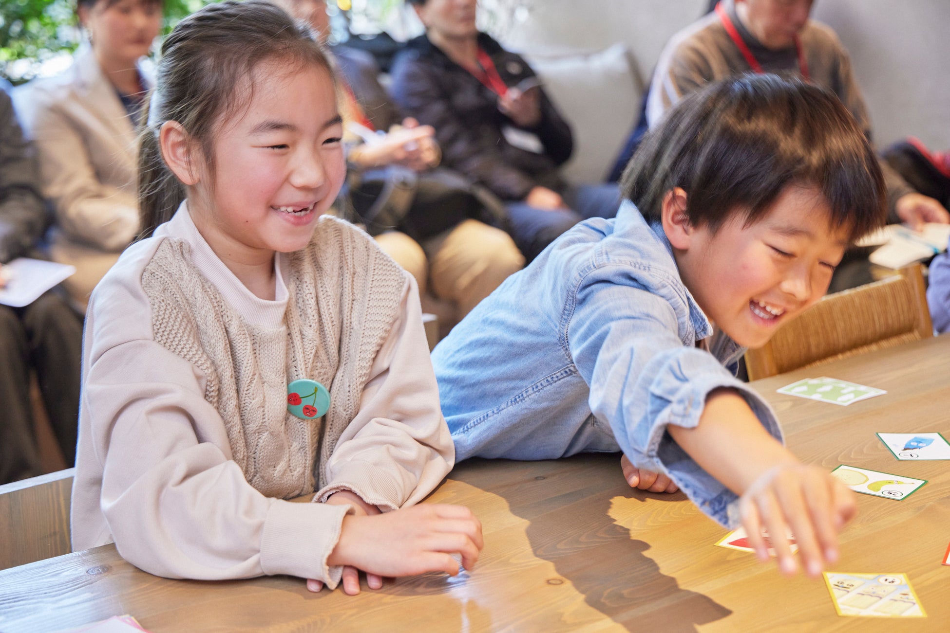 アプリの体験会に合わせ、”もぐみん”が描かれた「もぐもぐタウンかるた」を使って食の豆知識や旬について学ぶ「もぐもぐタウン」かるた体験会も実施しました。食材や栄養に関する読み札が読まれると、その場から立ち上がって絵札を探す様子も見られました。はじめのうちはかるたに夢中になっていましたが、次第に読み札の内容にも意識が向くようになり、エビの漢字表記についての読み札が読まれた時には「エビって“海の老人”って書くんだ」と驚きの声を上げるなど、楽しみながら食や栄養の知識を吸収している様子があちらこちらで見受けられました。