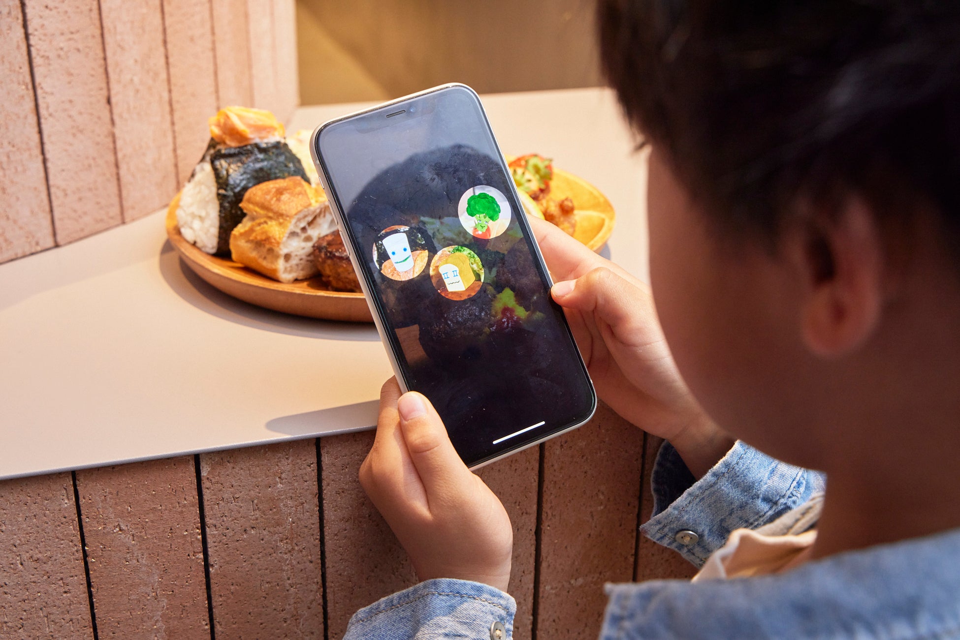 アプリの説明を受けると、いよいよ食事の中に隠れたキャラクター”もぐみん”探しがスタート。参加者は、会場に用意されたビュッフェ形式の食事を取り分けて、「もぐもぐタウン」のアプリを用いて食事を撮影。食事の写真から”もぐみん”が出現すると、参加者は「たまねぎだ!」「トマトが出てきた!」「かわいい!」などの声が上げながら笑顔を覗かせ、すぐに「もぐもぐタウン」の世界に入り込んでいる様子でした。見つけた”もぐみん”を、お友だちやお母さん、お父さんに見せて喜んだり、「もぐもぐタウン」が発展しレベルアップすると目を輝かせたり、そして”もぐみん”から出される食や栄養に関するクイズに挑戦したりと、それぞれの参加者が思い思いに楽しんでいる様子が印象的でした。
