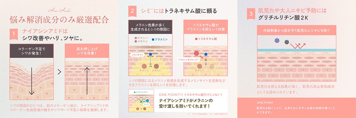 *1:有効成分として、ナイアシンアミド、トラネキサム酸、グリチルリチン酸2Kの3種類を配合した薬用化粧品において(2023年11月 販売元調べ)