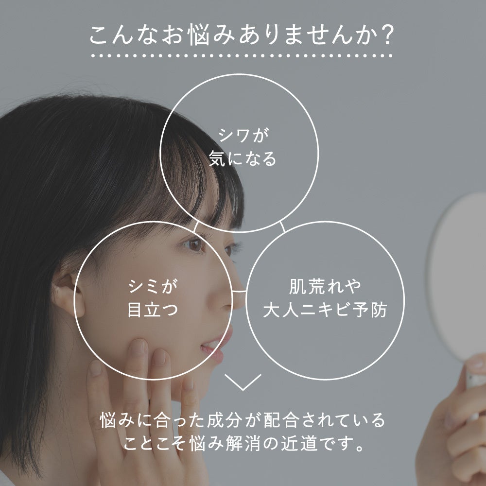 女性の30代、40代から目立ち始めると言われる額・目まわり・ほっぺた・口まわり・首・肩・背中・手・手の甲・足などほぼ全身に現れてくるシワ・シミ(*2)、肌荒れ・大人ニキビ予防などでお悩みの方たちへ。