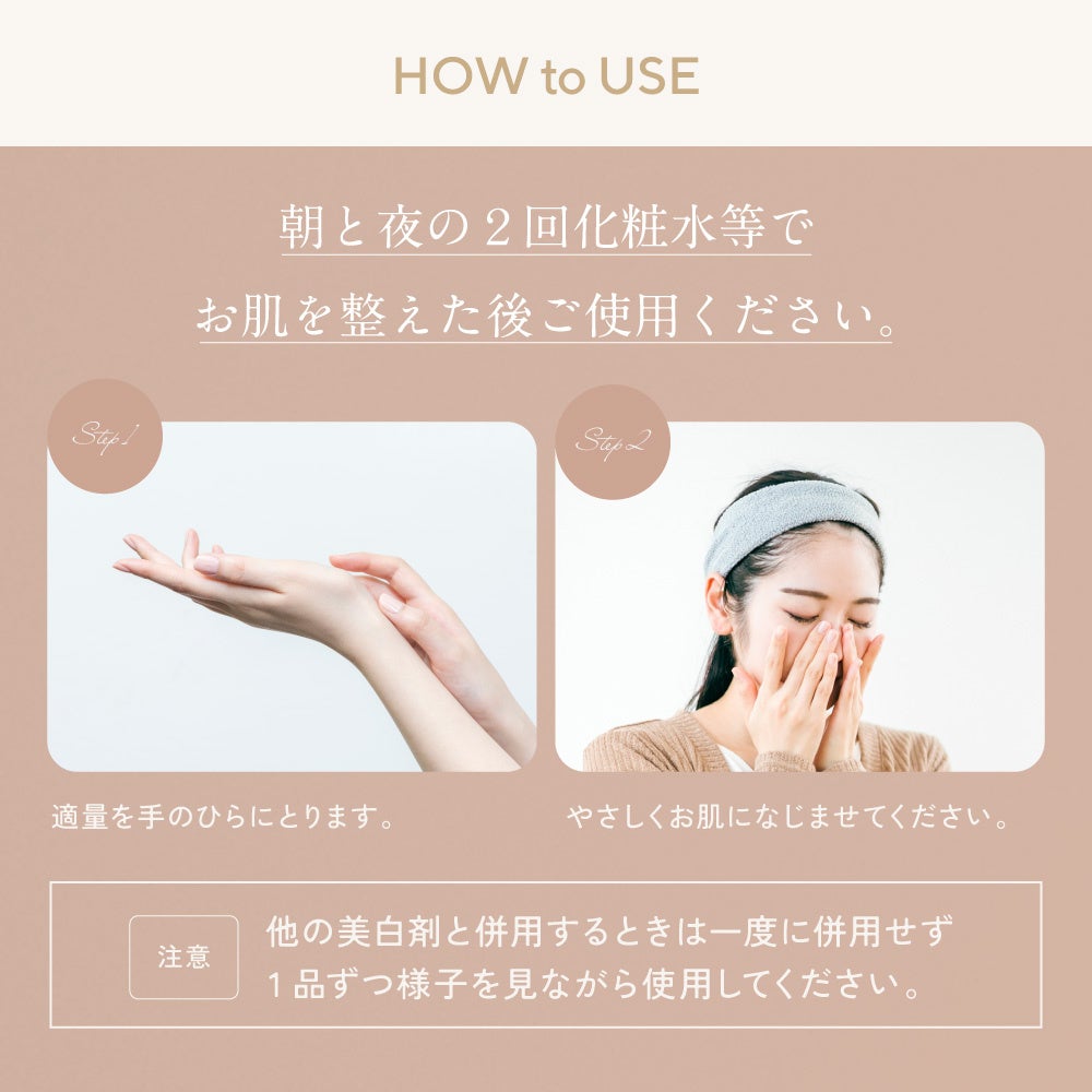 朝と夜の2回、化粧水等でお肌を整えた後、適量を手のひらにとり、やさしくお肌になじませてください。