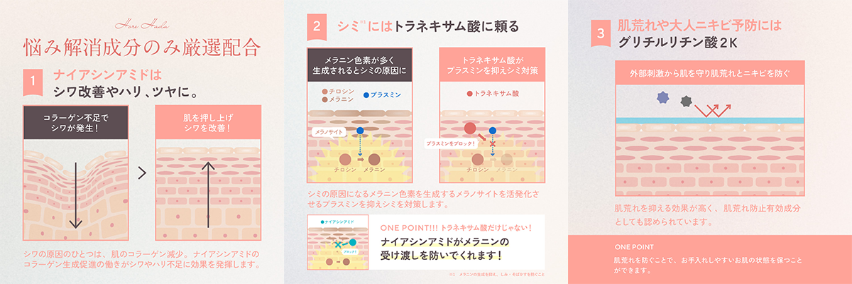 ※1有効成分として、ナイアシンアミド、トラネキサム酸、グリチルリチン酸2Kの3種類を配合した薬用化粧品において