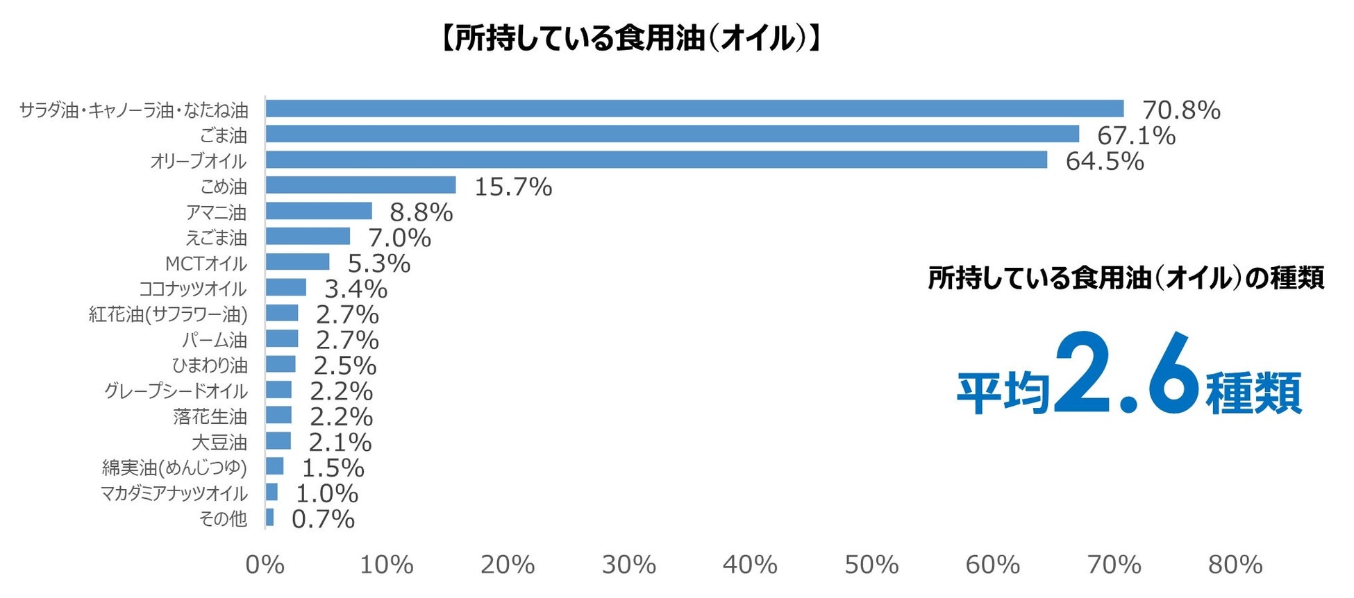 食用油を所持している種類数は平均2.6種類。所持している食用油 1位「サラダ油・キャノーラ油・なたね油」、2位「ごま油」、3位「オリーブオイル」