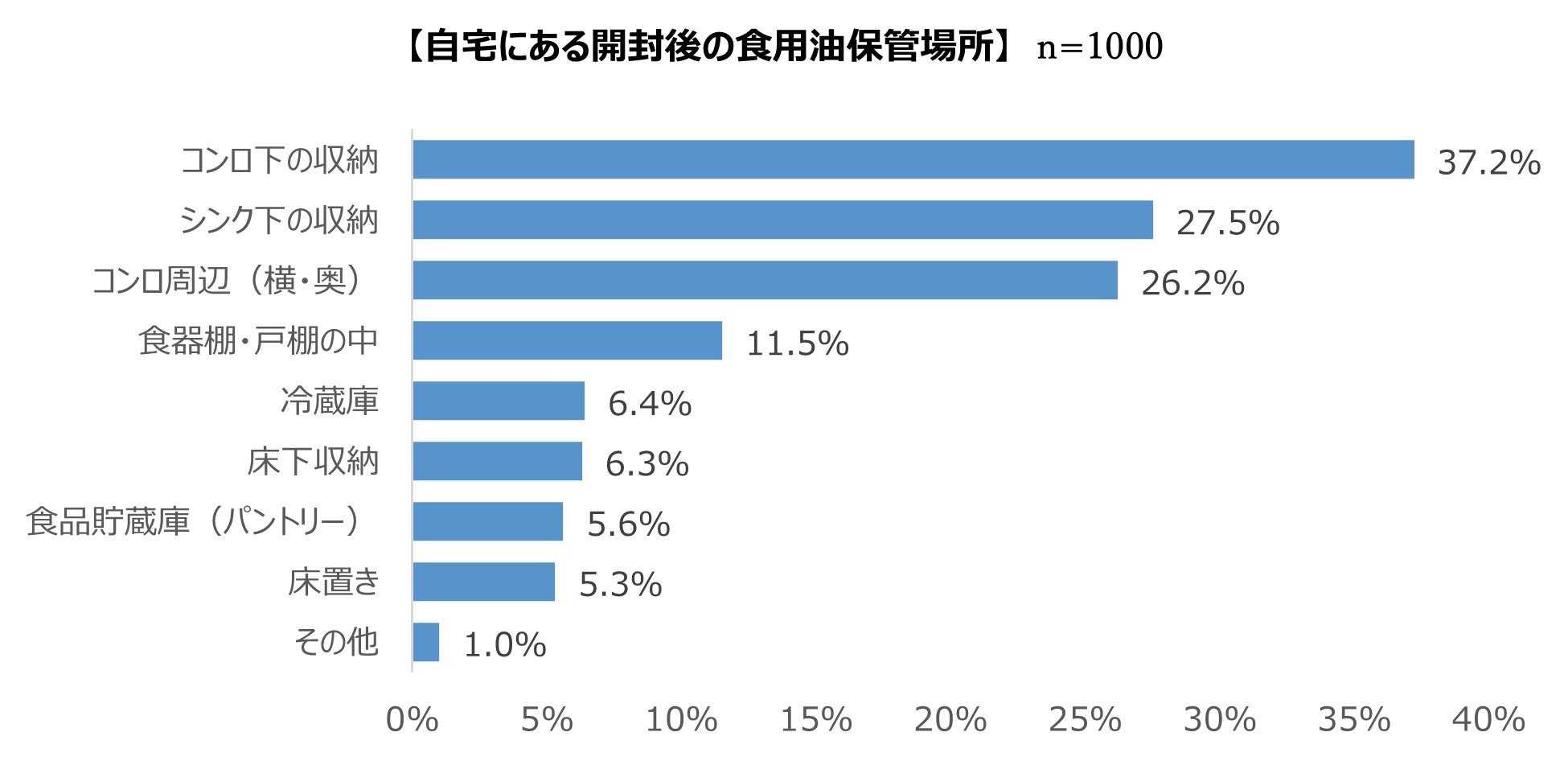 ご自宅にある開封後の食用油(オイル)の保管場所についても聞いてみたところ、1位は「コンロ下の収納(37.2%)」、2位「シンク下の収納(27.5%)」、3位「コンロ周辺(横・奥)(26.2%)という結果となりました。この結果からも、開封後のオイルの保管場所では、キッチン周辺の中でも油の酸化の大敵の一つでもある”熱”に近いところに保管をしているケースが多いということも判明しました。
