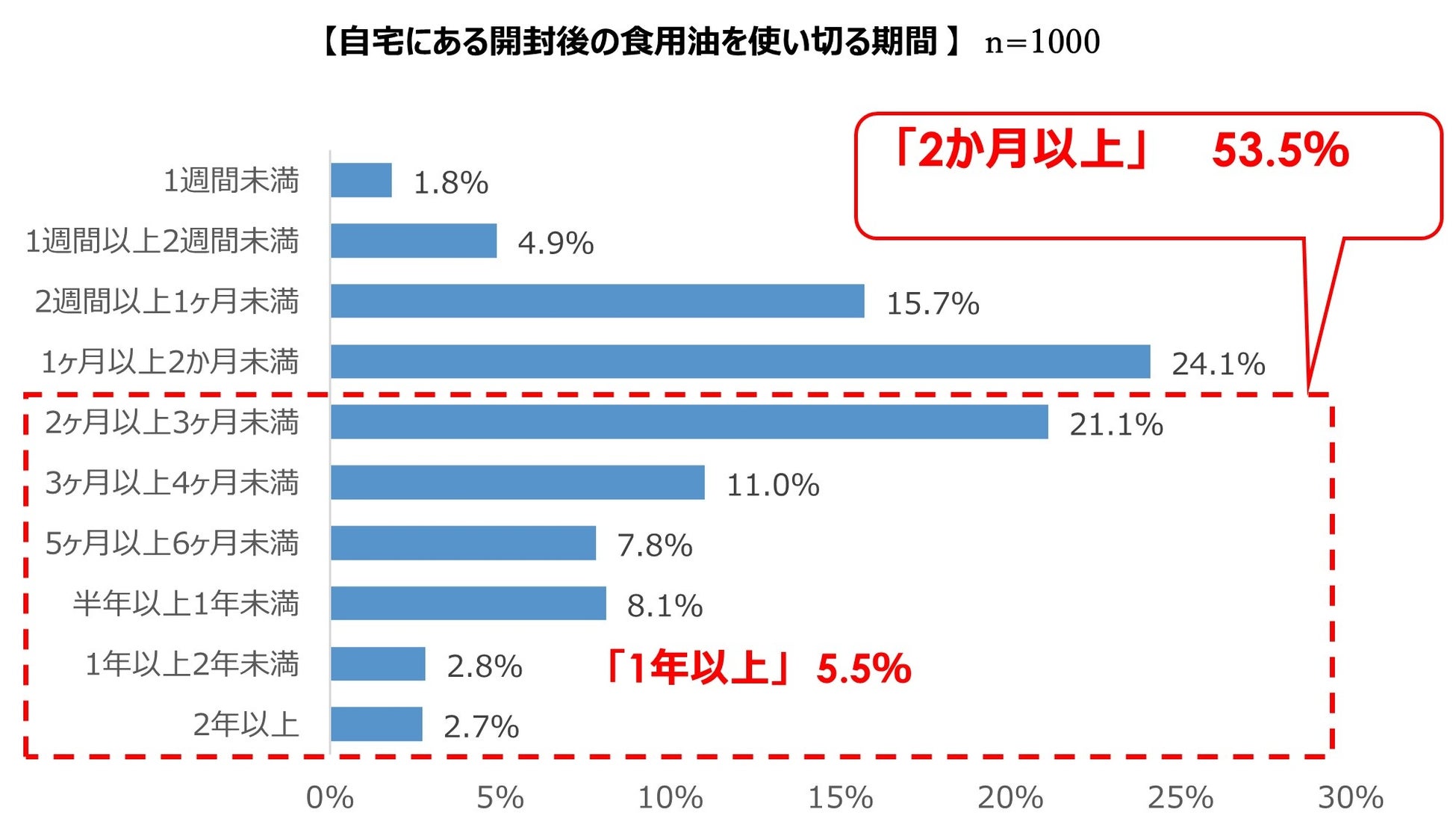 食用油(1本)を使い切る期間、半数以上が「2か月以上」、「1年以上」は5.5%も!