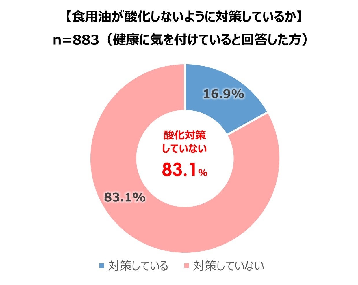 また、「健康に気を付けているか」という設問に対し、「気を付けている」と答えた883名に対し、「食用油(オイル)の酸化対策をしているか」と聞いたところ、約8割(83.1%)が「酸化対策していない」と回答しました。この結果からも健康に意識が高い人でも、8割もの人が、「酸化対策ができていない」のが現状ということも判明しました。